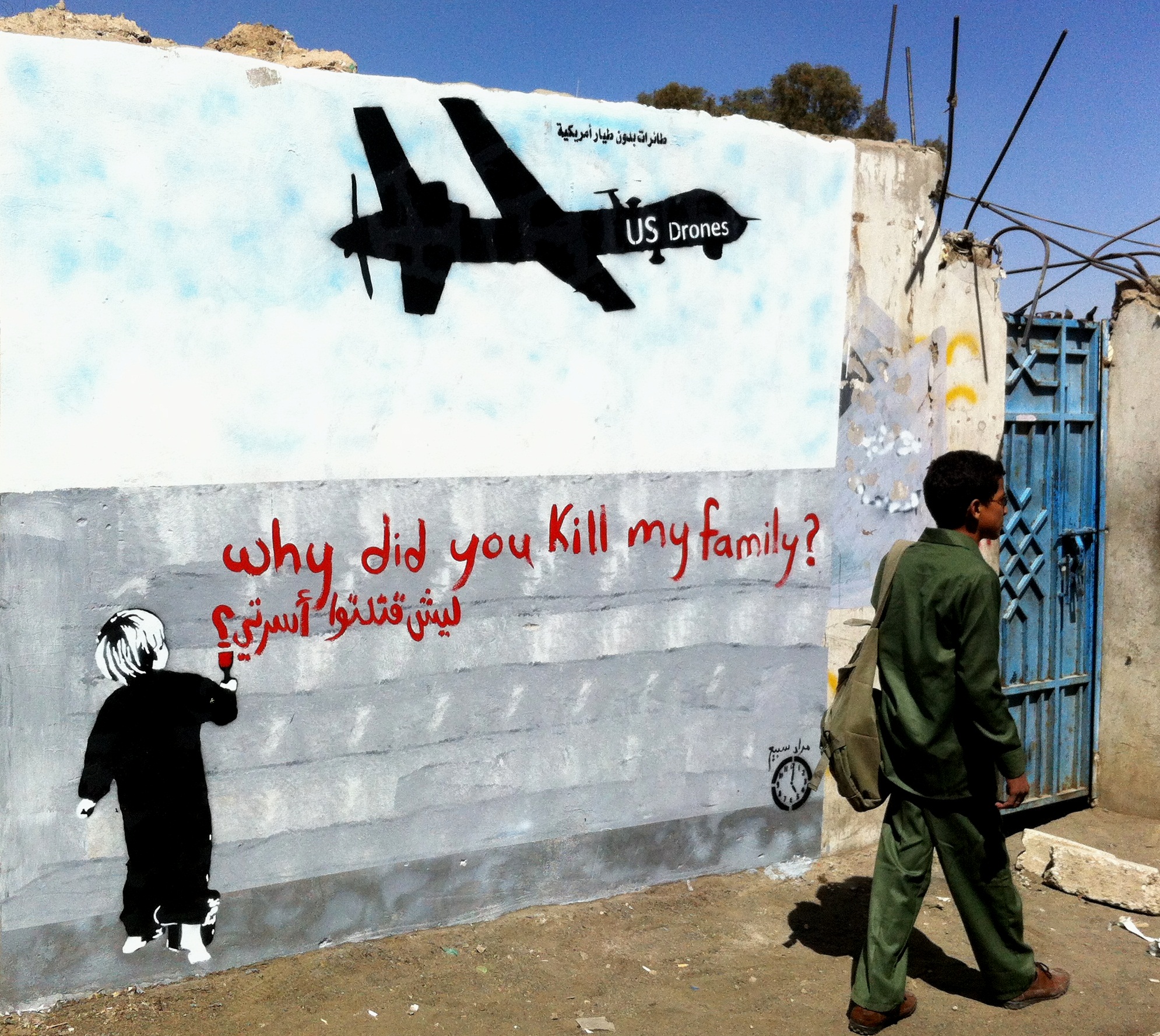 هذه رسالة الطفل الموجود في جداريتي بعد أن قتلت الطائرة بدون طيار الأمريكية أسرته في قصفها العشوائي.