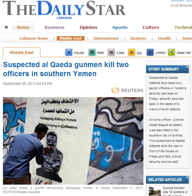 صوره لـ ربيع الجنيد أثناء عمله على جداريته حول “الإختطاف” في الساعة الـثالثة ضمن حملة “12 ساعة”، نشرت في صحيفة “الدايلي ستار” اللبنانية. تصوير: خالد عبدالله “رويترز Share this:Tweet Click to print (Opens in new window) Print Click to share on Reddit (Opens in new window) Reddit Share on Tumblr Click to email a link to a friend (Opens in new window) Email Related