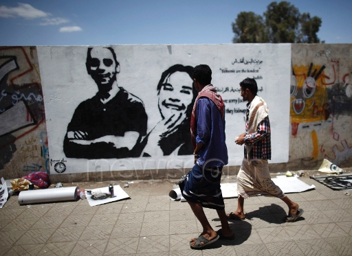 People walk past a graffiti depicting kidnapped Dutch journalist Judith Spiegel (R on wall) and her partner Boudewijn Berendsen in Sanaa September 5, 2013. The couple were abducted in Sanaa mid-June and are still held hostage by their kidnappers. The graffiti is part of a campaign launched by artists and activists against kidnapping in Yemen
