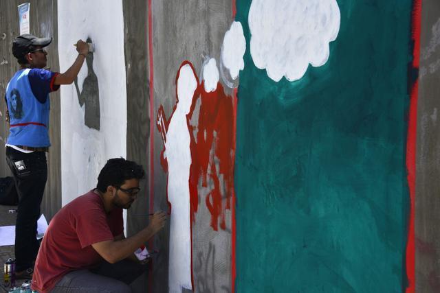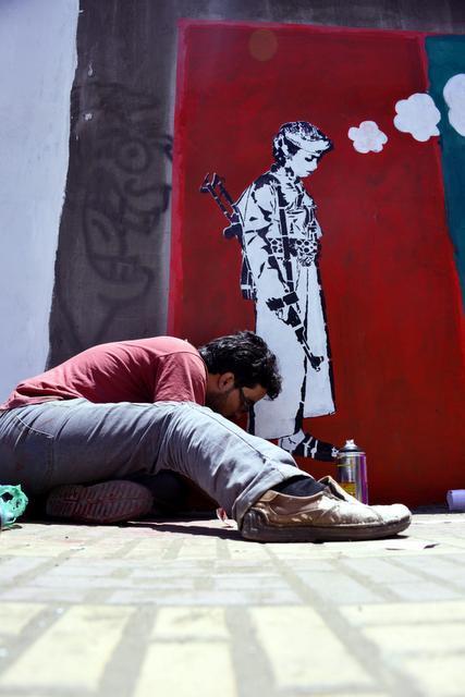 Un artista yemení pinta un grafiti en el que se muestra un niño soldado con motivo de una campaña para acabar con el reclutamiento y el uso de los niños en los conflictos en Saná, Yemen, hoy, jueves 10 de abril del 2014. Varios artistas yemeníes lanzaron una campaña para acabar con el reclutamiento de las milicias y los grupos rebeldes de los niños soldado para los confictos del país. YAHYA ARHAB / EFE
