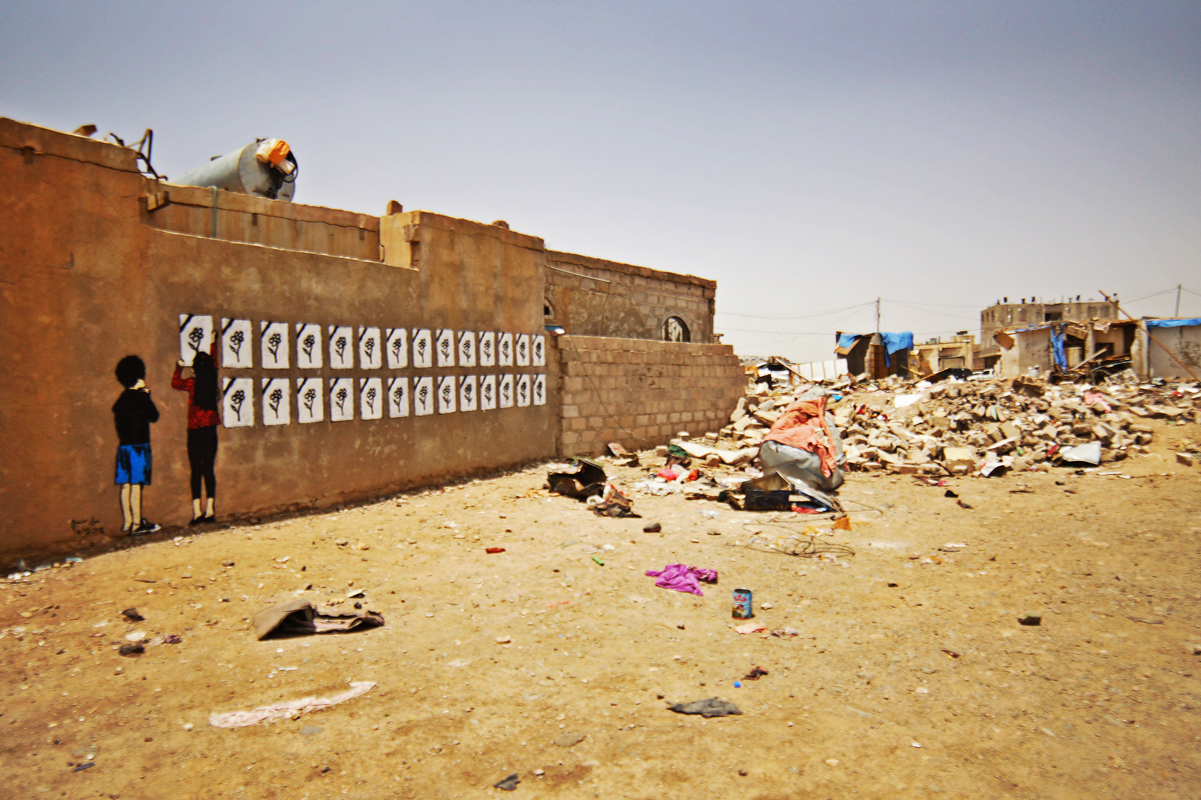 “Ruins” is a new campaign to paint on what is left of the walls left by the external and internal wars in Yemen. The campaign was launched on May 18, 2015, in Bani Hawwat area, Sana’a Governorate, where the air strikes destroyed more than seven houses there and killed 27 civilians, including 15 children. Among those who joined me in drawing were the youth and children of the area as well as some friends who came with me from Sana’a. “Ruins” campaign is currently targeting the areas that are destroyed by the air strikes in both, the Capital and Sana’a governorate. The campaign aspires to move to Taiz, Aden and other provinces that are subject to destruction by the internal conflicts, but only if the appropriate conditions allowed us to such as ease of access and accessibility to fuel & transportations. Until then, “Ruins” campaign will seek to cover the devastated areas, which are accessible under these hard times we are experiencing here in Yemen.