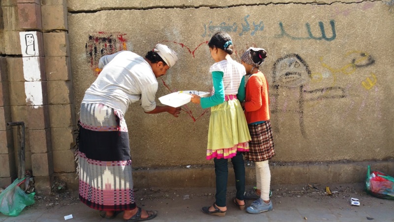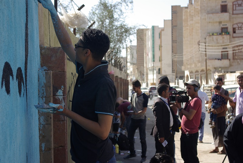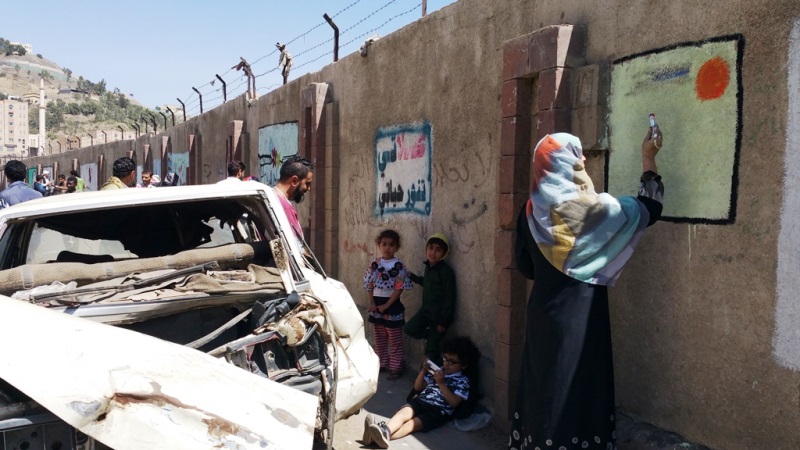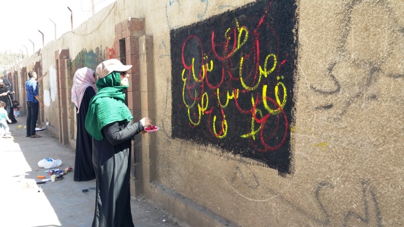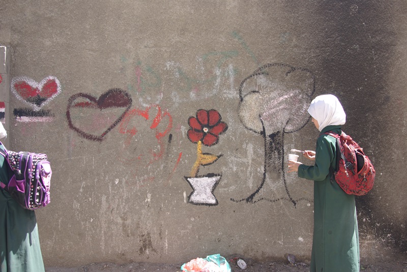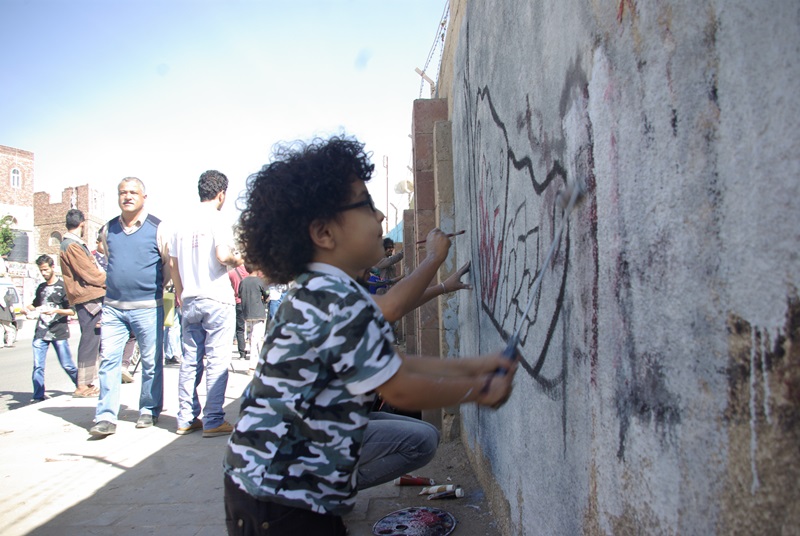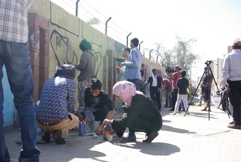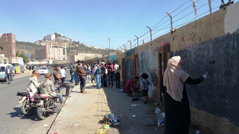 صور لنشاط الرسم على الجدران بمشاركة واسعة من الناس كبار وصغار. ضمن الحدث السنوي للرسم على الجدران “اليوم المفتوح للفن”، على الجدار الجنوبي لجامعة صنعاء الجديدة، في الشارع المتفرع من شارع الرباط، بالقرب من قسم 14 اكتوبر. 15 مارس 2017.