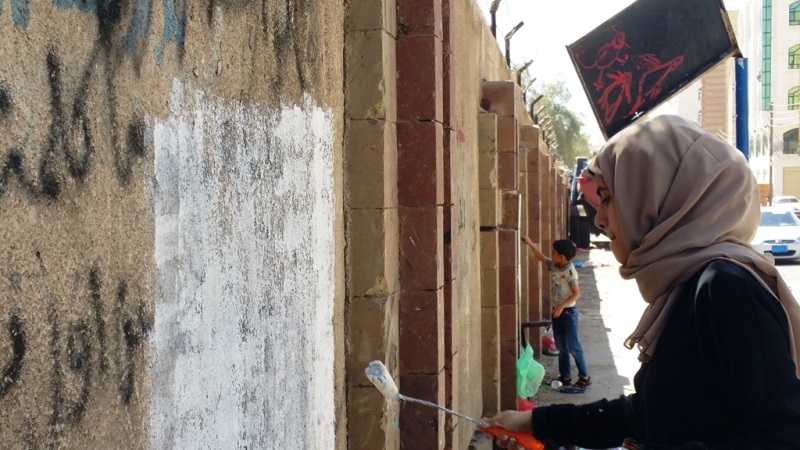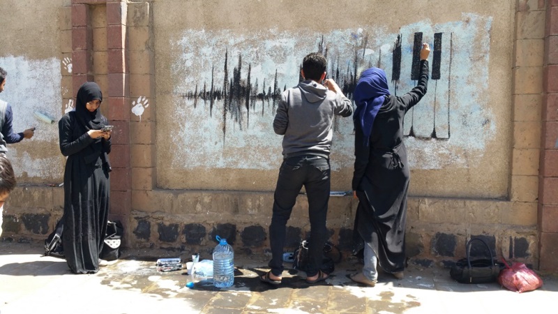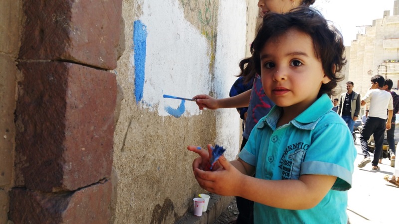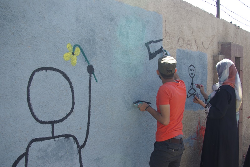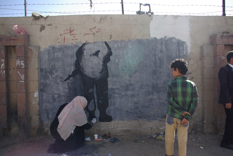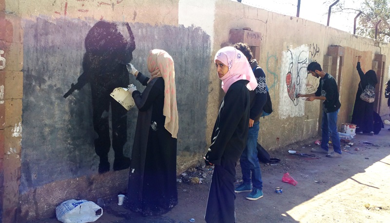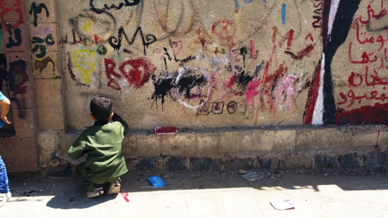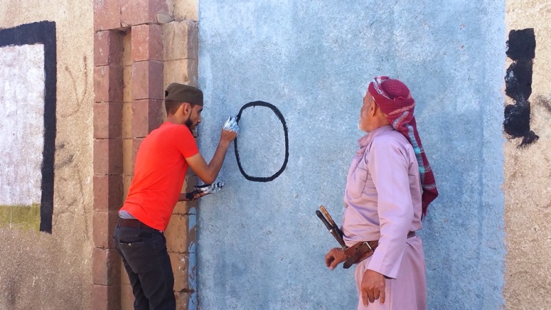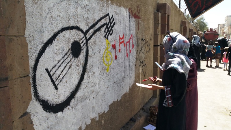 صور لنشاط الرسم على الجدران بمشاركة واسعة من الناس كبار وصغار. ضمن الحدث السنوي للرسم على الجدران “اليوم المفتوح للفن”، على الجدار الجنوبي لجامعة صنعاء الجديدة، في الشارع المتفرع من شارع الرباط، بالقرب من قسم 14 اكتوبر. 15 مارس 2017.