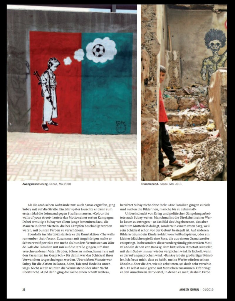 An article title, on “Amnesty Journal”, Germany, in an interview about my work by the amazing author”Cornelia”, and it was published in four pages.