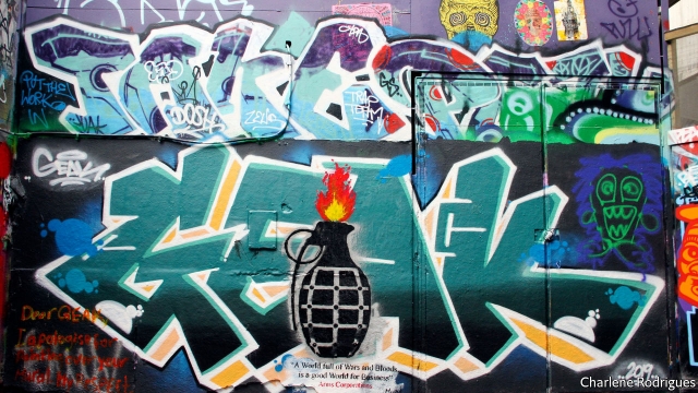 Similar works of street art can be found in Hodeida and Sana’a, cities in Yemen: on the wreck of a door, now in a garbage dump, or on the last standing wall of a house reduced to rubble. “Faces of War”, a project by Murad Subay, a Yemeni artist, seeks to draw attention to the worst humanitarian crisis in the world. Since the outbreak of civil war in 2014 between Houthi rebels, a Shia militia backed by Iran, and government forces, backed by Saudi Arabia, the water, power, health-care and education systems have failed. The country has suffered the worst cholera outbreak in modern history and faces famine. The United Nations estimates that three-quarters of the population of 28m need some sort of assistance.