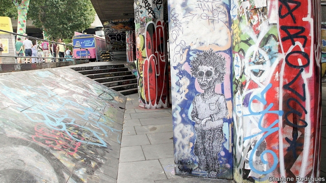 FREQUENT VISITORS to the skatepark on London’s South Bank may have noticed two new works of art among the decades-old graffiti. Both spray-painted in black and white, one image depicts a naked and emaciated mother clutching a newborn; another shows a starving boy, his hair on end, listlessly picking at his hands. Entitled “Hollowed Mother” and “Lost Generation” (pictured), the figures are cadaverous and haunting, with dark empty holes where their eyes should be.