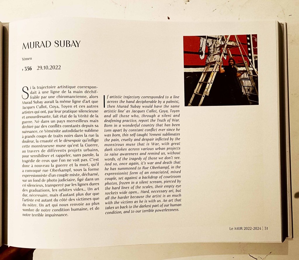 « Si le parcours artistique se mesurait à une ligne dans la paume de la main que pourrait lire une voyante, Murad Subay aurait la même “ligne artistique” que Jacques Callot, Goya, Twain, et tous ceux qui ont raconté, par une pratique sourde et acharnée, la vérité de la guerre. Né dans un pays magnifique mais déchiré par des conflits permanents depuis sa naissance, ce Yéménite autodidacte sublime la douleur, la violence et le désespoir engendrés par cette inspirante monstruosité qu’est la guerre, à travers de lourds coups de noir dans différents projets urbains, afin de sensibiliser et de rappeler — sans mots — la tragédie de ceux que l’on ne voit pas. Ainsi, une fois encore, il convoque la guerre et la mort rue Oberkampf, sous la forme expressive d’un couple mixte, émacié, sur fond d’images judiciaires, figés dans un cri muet, traversés par les lignes dures des dégradés, leurs orbites vides grandes ouvertes… Un art dur, nécessaire, mais d’autant plus dur que l’artiste se tient du côté des victimes autant que du nôtre. Un art qui nous renvoie à la part la plus sombre de notre condition humaine, et à notre impuissance abyssale et terrifiante. »