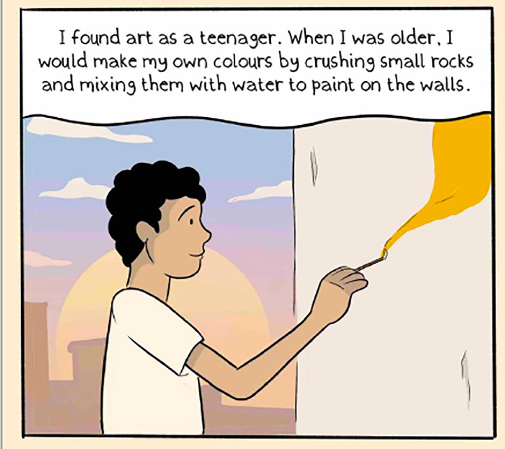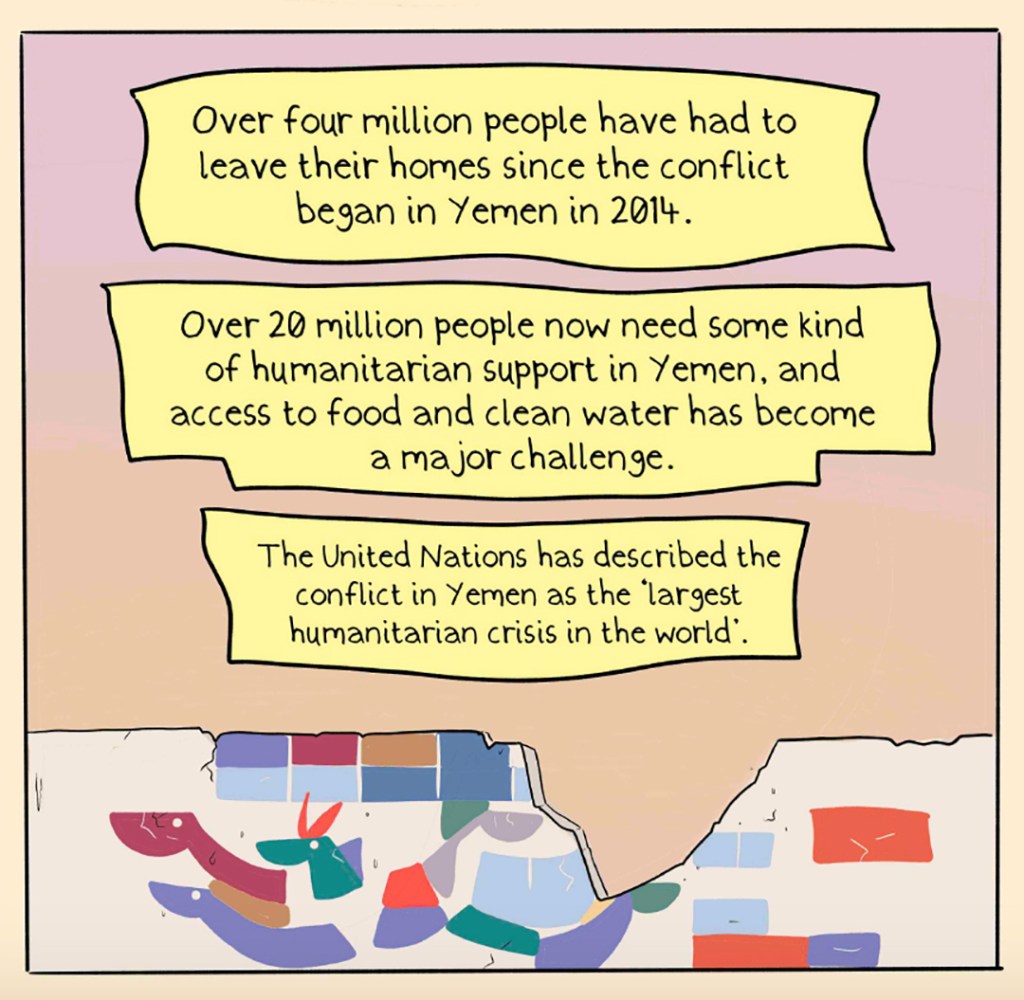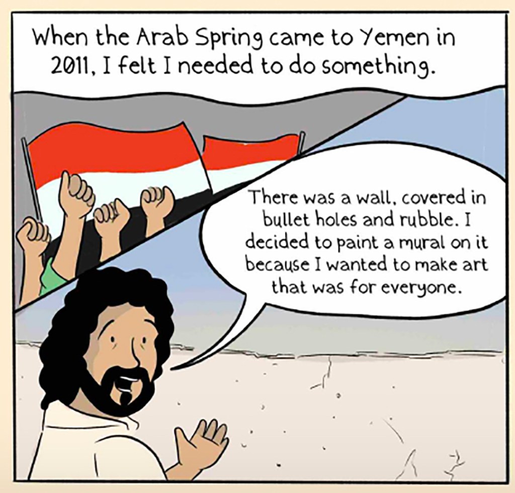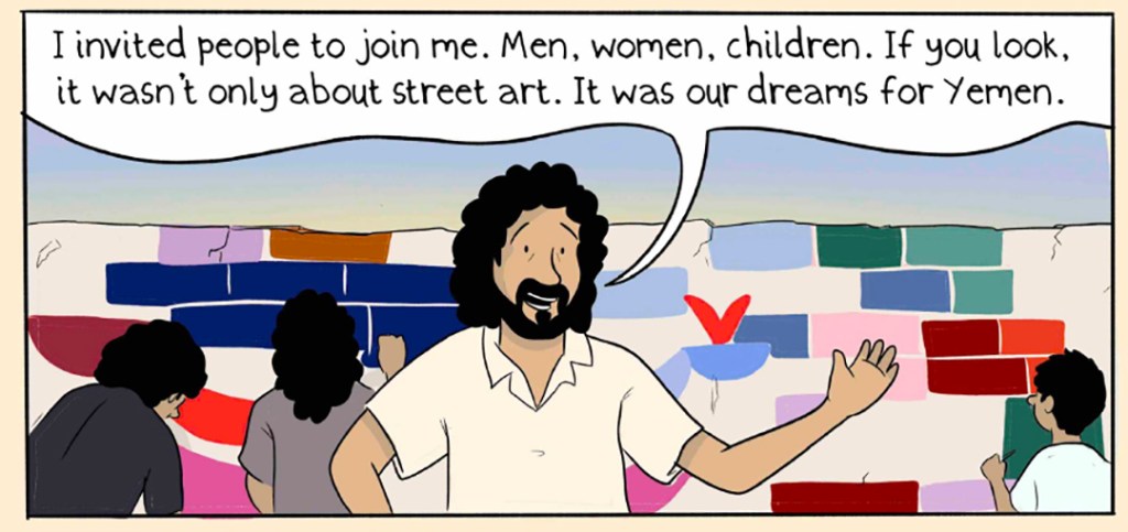 The title of the comic, published today by”The imperial museum of Wars” in London, in which my work and my experience in street art are presented through 10 slids of comics, and it is accompanied by an audio material in which I talk about bright sides in Yemen.