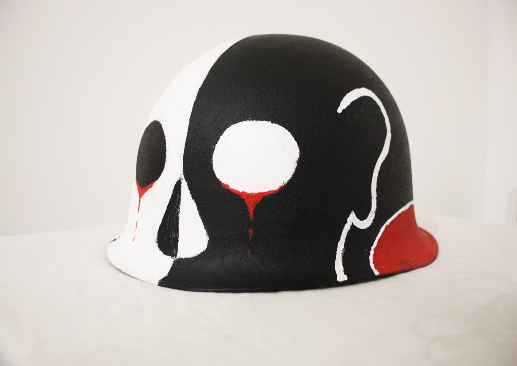 “Face of War” with black and white, and a red background. The second work from the “War Helmet” collection by Yemeni artist Murad Subay, on a military helmet that served in one of the armies, between the eighties and the nineties of the last century.