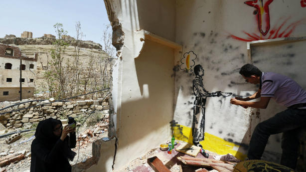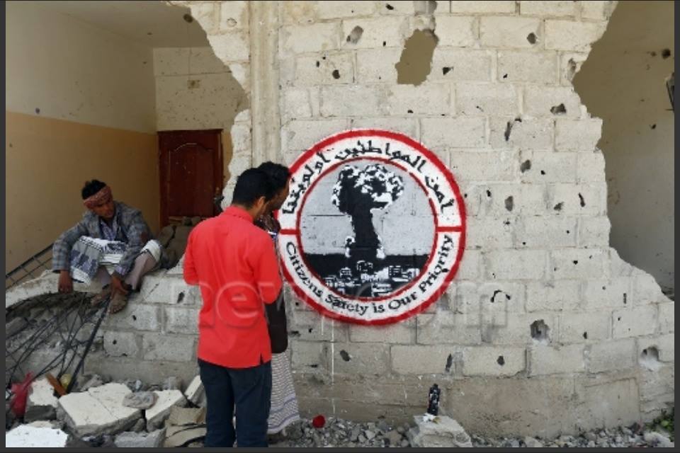 وقال الفنان اليمني: «أنا والأصدقاء رسمنا كثيرا من الجداريات، كانت هناك قضايا كثيرة حول الاختطاف، حول الدرونز – الطائرات بلا طيار – وقضايا شاملة أيضا. ثم في آخر جدارية ما تبقى منها هي في آخر حملة حطام في هذه الحرب حول الحصار».
