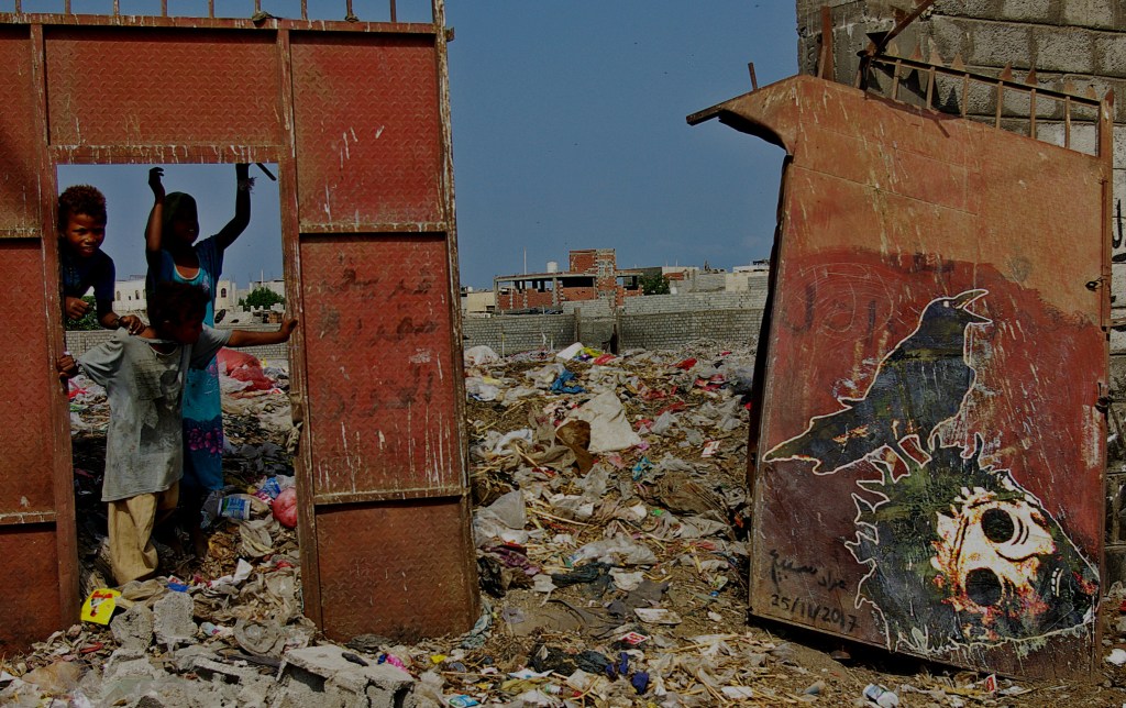 في الصورة الأولى ، جدارية بعنوان “الهاوية” في تشرين الثاني 2017 ، رسمها الفنان اليمني مراد سبيع ضمن حملته “وجوه الحرب” ، وهي مجموعة من الجداريات التي نفّذها في مناطق الحروب ، وأنقاض الحرب المستمرة. في بلده اليمن.