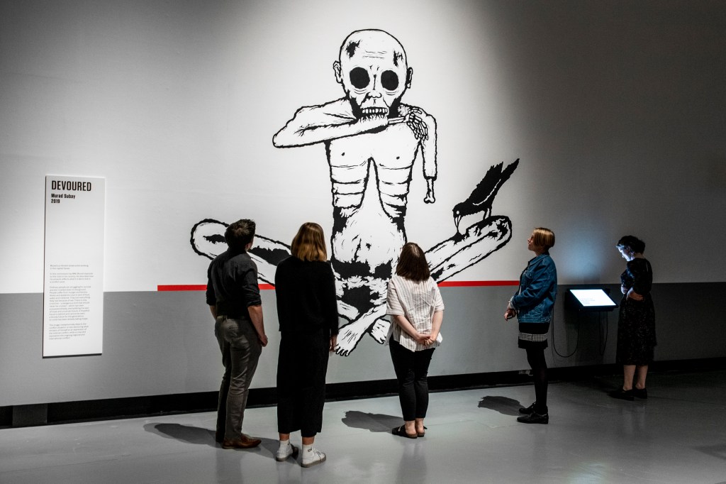 Ahead of opening the major exhibition Yemen: Inside a Crisis at IWM North on 17 May 2019, Imperial War Museums (IWM) announces its commission of a new artwork by Yemeni street artist Murad Subay. Created especially for IWM, the artist’s latest work, Devoured (2019), will form part of the UK’s first exhibition to address Yemen’s current conflict and humanitarian crisis.