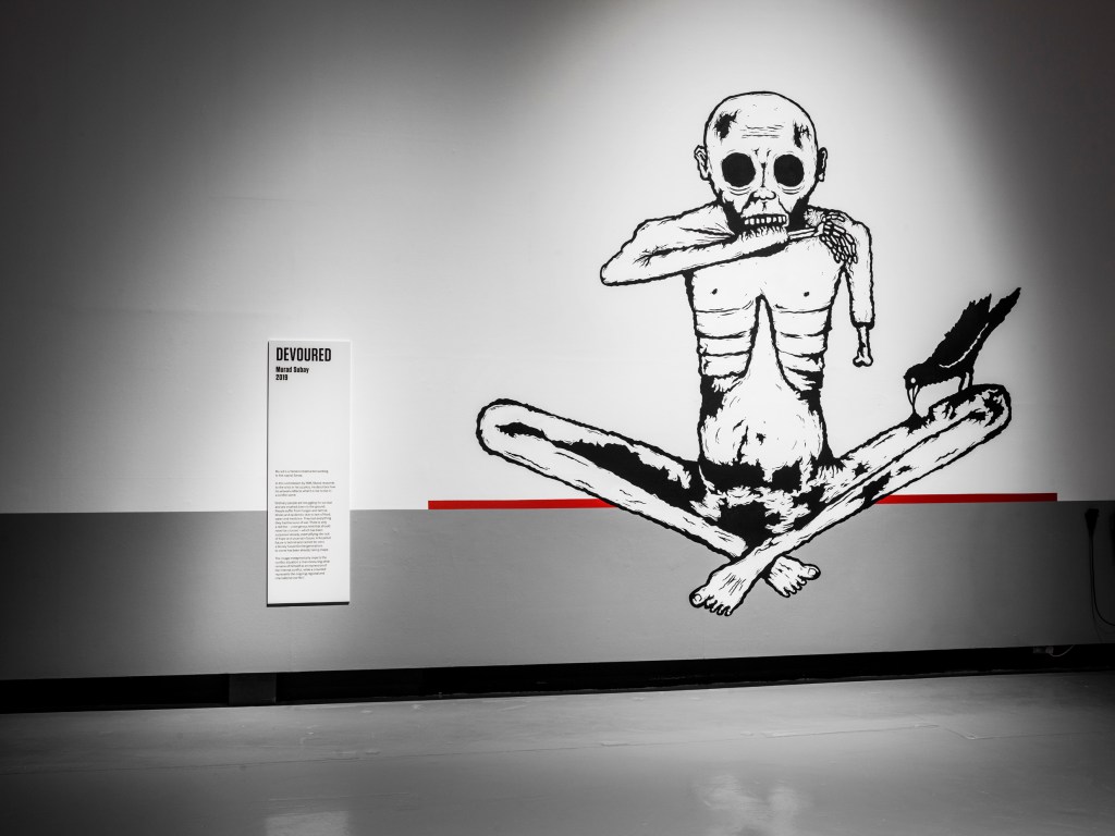 Commenting on Devoured, artist Murad Subay said: “Ordinary people are struggling for survival and are crushed down to the ground. People suffer from hunger and famine, illness and epidemics due to lack of food, water and medicine. They lost everything they had because of war. There is only a red line – a dangerous limit that should never be crossed – which has been surpassed already, exemplifying the lack of hope and uncertain future.”
