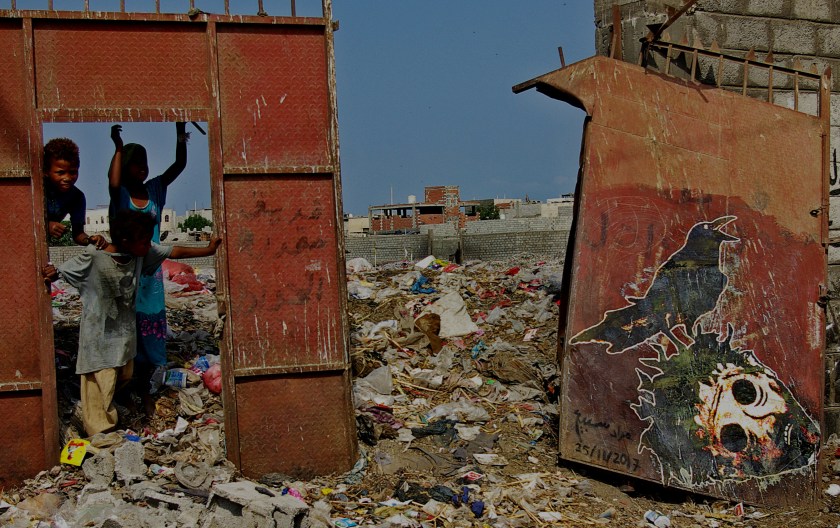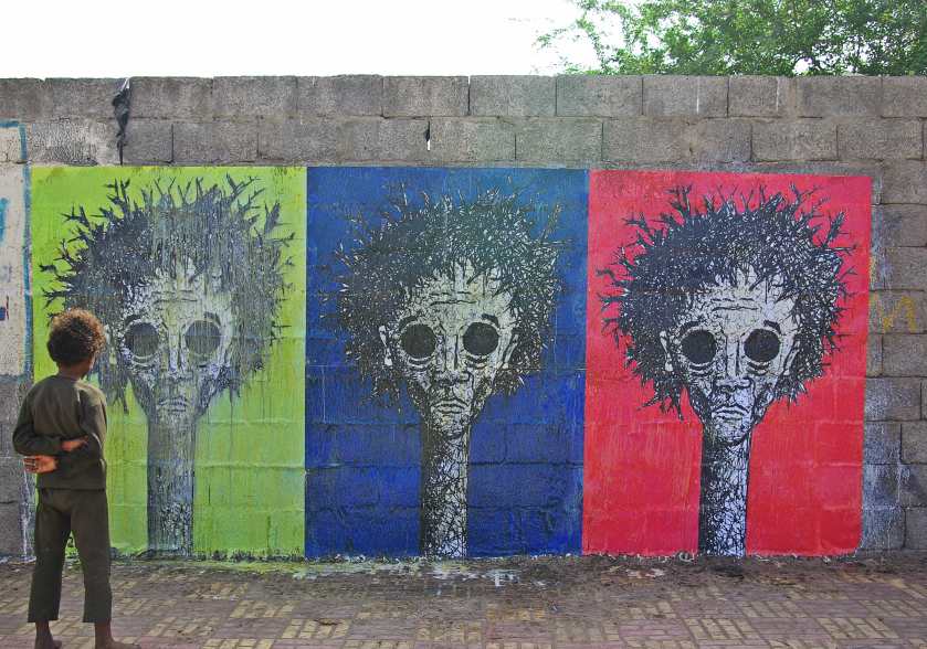 The three-metre (10 ft) high mural entitled “Last Dance of the Dead” was created by Murad Subay. He started painting when the conflict in his country broke out in 2014 to raise awareness on arbitrary arrests before taking his brush to the bombed out rubble in the capital Sana’a.