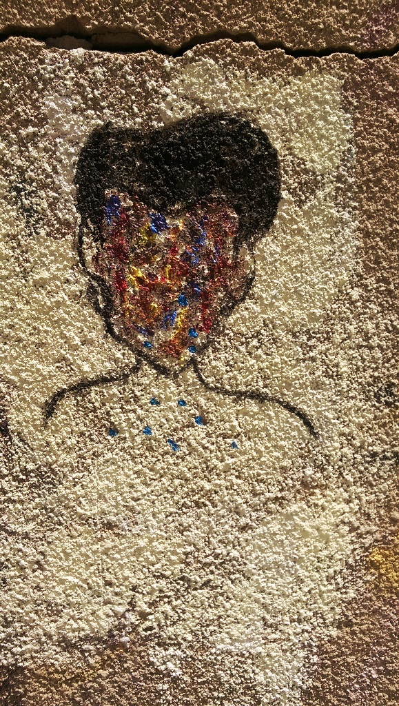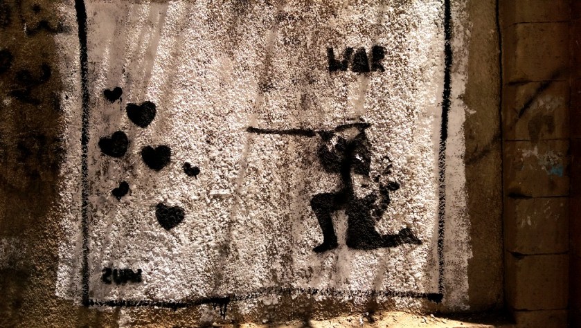 His graffiti metaphorically depicts the ugliness of war, like a malnourished child locked in a blood-red coffin or a small girl about to pick up a flower sticking from a landmine that’s about to explode.