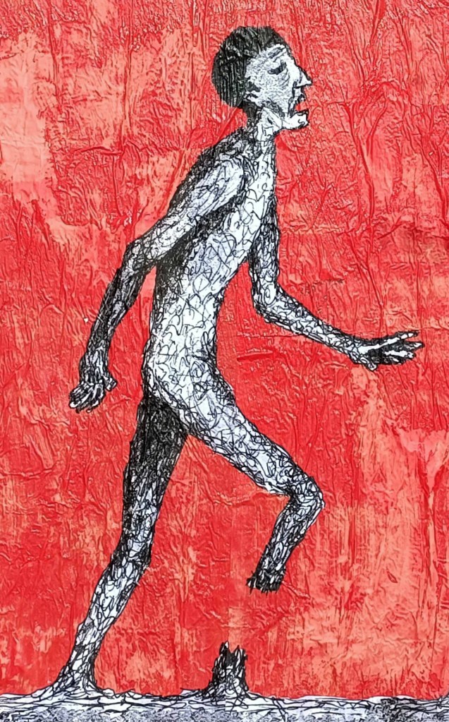 Son collage représente une famille composée de trois personnes, une femme sur la droite de l’œuvre, un homme à gauche et au centre un jeune garçon. Les trois personnages figurent une scène : une mère accueille son jeune garçon qui court la rejoindre suivi par son père.