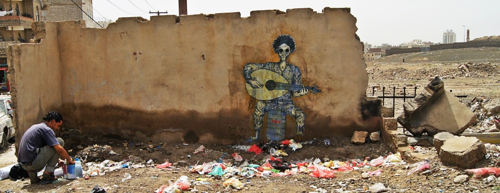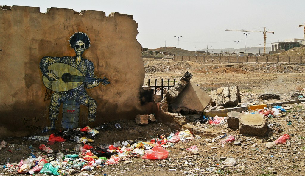 *أعتذر على تسمية الجدارية الفجة, لكنها تصف حال اليمنيين اليوم ونظرتهم للحرب وللعيش في زمنها.